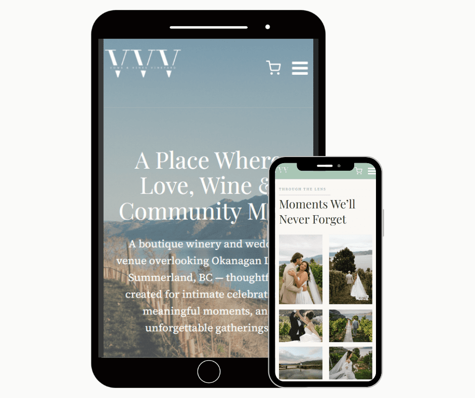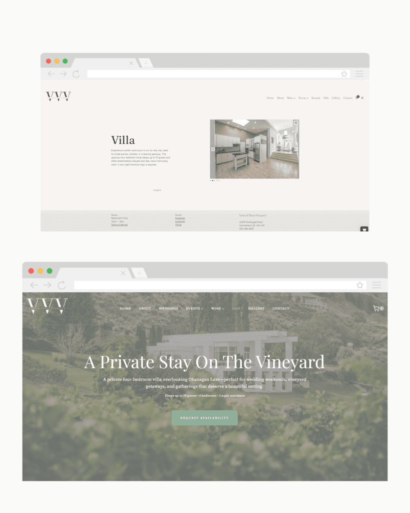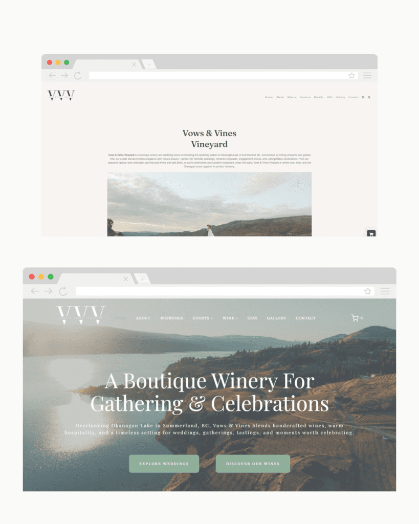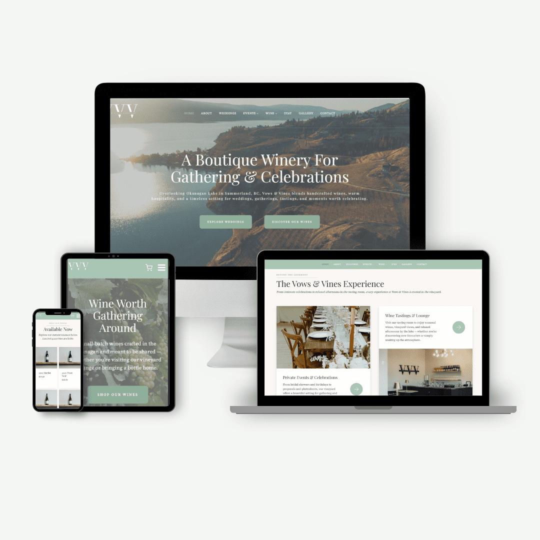 Vows & Vines Vineyard is a boutique winery and hospitality destination in the Okanagan, offering wine tastings, weddings, private events, seasonal gatherings, and a villa stay experience. As the business expanded, their existing website no longer reflected the full scope of what they offered or how the brand had evolved — creating friction for both bookings and customer understanding.