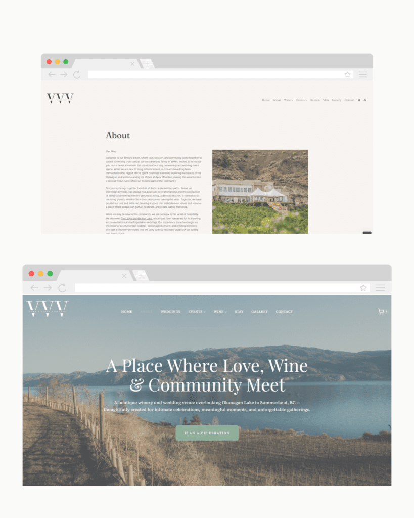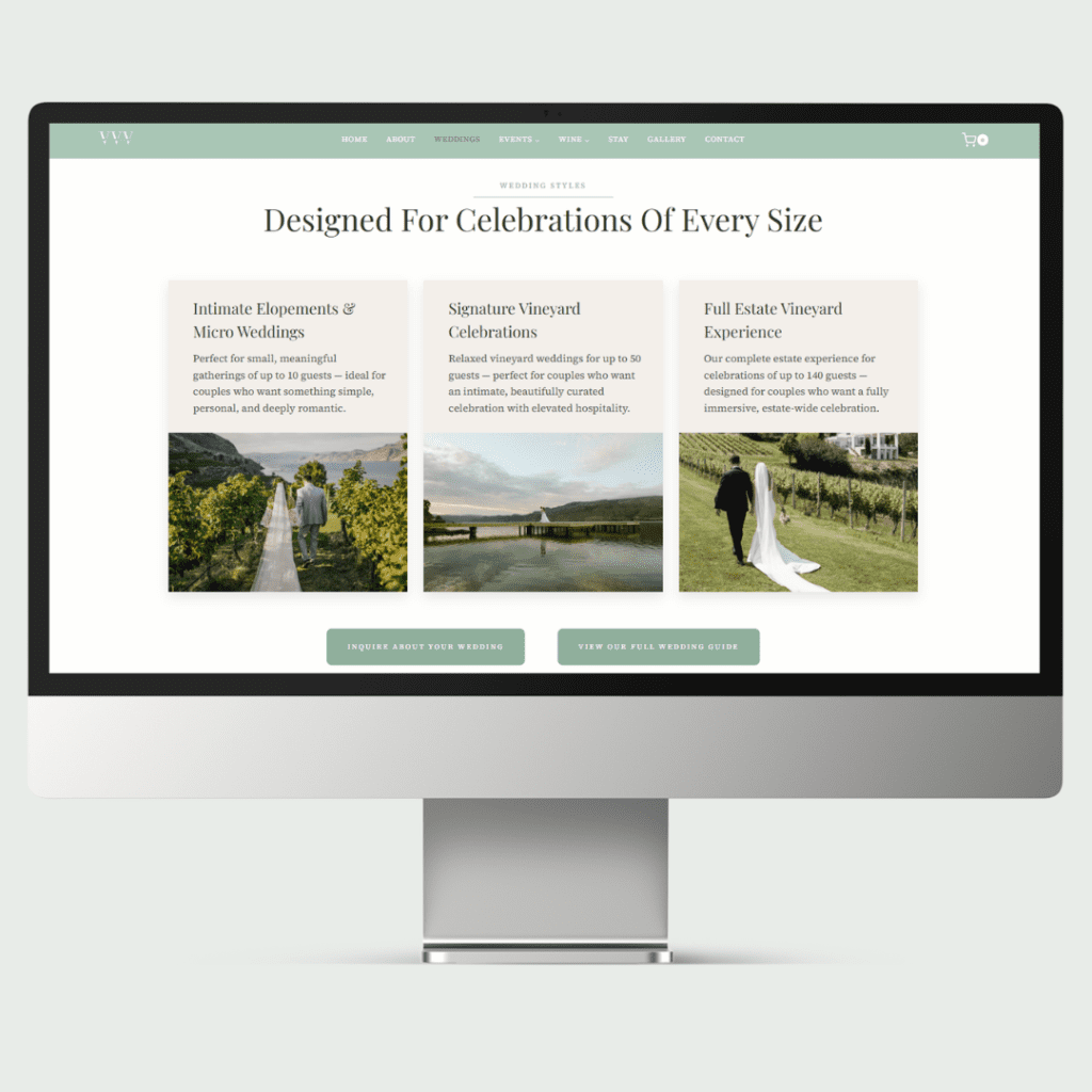 The result is a more structured, intentional website that reflects the full scope of the business and supports how it operates today. Visitors can now clearly navigate between wine, events, stays, and bookings — creating a more cohesive experience that aligns with the brand and supports continued growth.