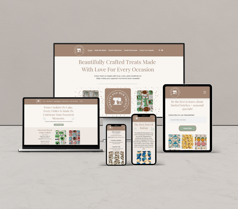 A fresh, modern website for Sweets and Her Treats — designed and built from the ground up, and now fully hosted and managed by Bridge & Bloom Creative.